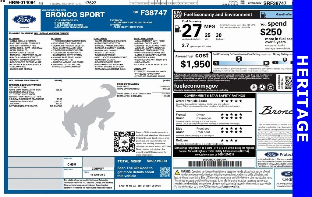 Bronco Sport Heritage, 4D Sport Utility, 1.5L EcoBoost, 8-Speed Automatic, 4WD, Azure Gray Metallic, Cloth, Convenience Package, Equipment Group 250A, Front Driver/Passenger Seat Back Map Pockets, Heated 8-Way Power Driver's Seat, LED Fog Lamps, Premium Wrapped Steering Wheel, Universal Garage Door Opener (UGDO). 25/30 City/Highway MPG