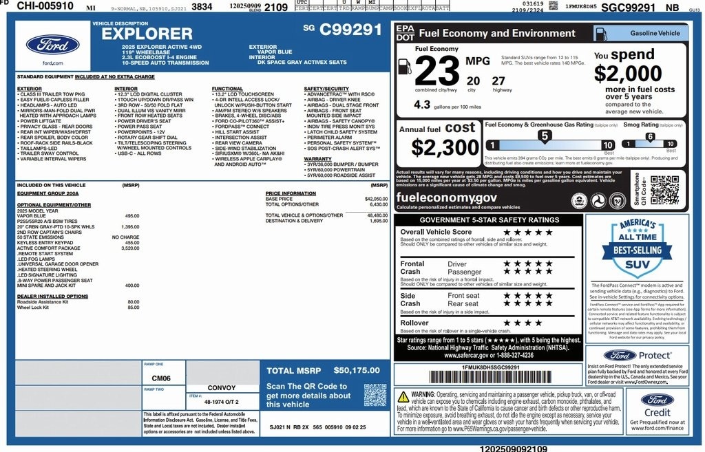Explorer Active, 4D Sport Utility, 2.3L EcoBoost I-4, 10-Speed Automatic, 4WD, Vapor Blue, Gray Cloth, Active Comfort Package, Equipment Group 200A Standard Package, Front Fascia, Heated ActiveX Seating Material Captain's Chairs, Heated Steering Wheel, Remote Start System, Second Row HVAC Controls, Universal Garage Door Opener (UGDO). 20/27 City/Highway MPG