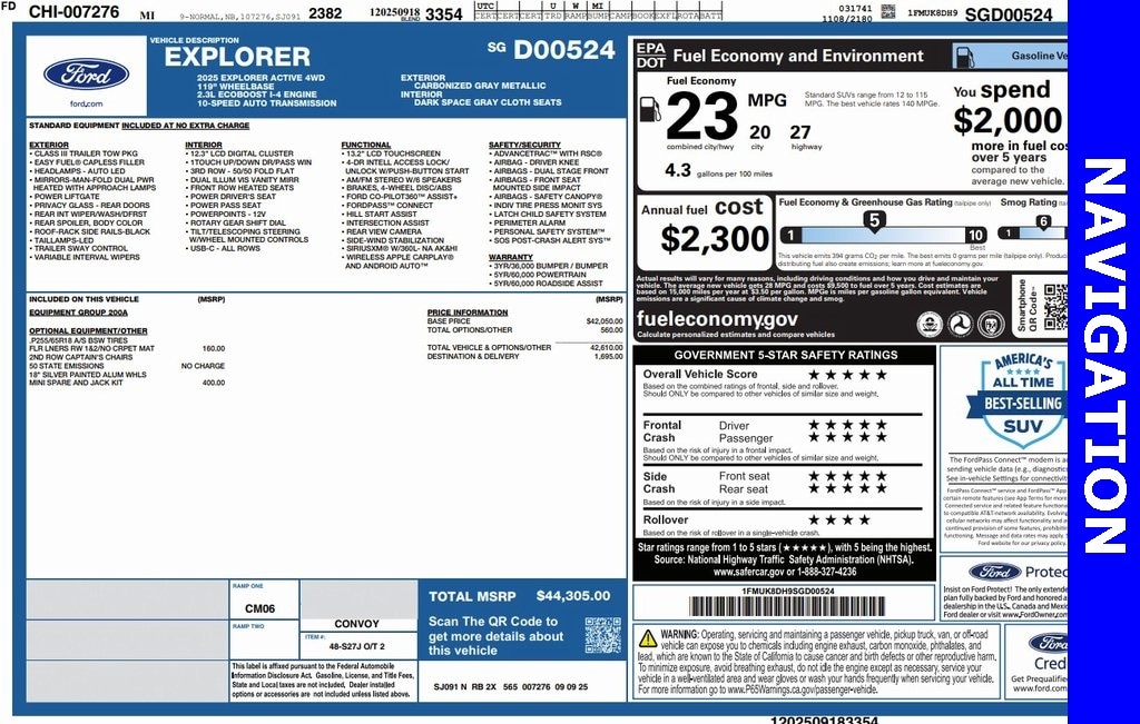 Explorer Active, 4D Sport Utility, 2.3L EcoBoost I-4, 10-Speed Automatic, 4WD, Gray, Gray Cloth, Equipment Group 200A Standard Package. 20/27 City/Highway MPG