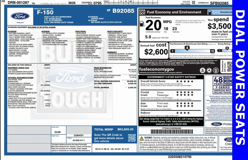F-150 XLT, 4D SuperCrew, 2.7L V6 EcoBoost, 10-Speed Automatic, 4WD, Marsh Gray, 40 Console 40 Medium Dark Slate Cloth, 360 Degree Camera, 400W Cab & Bed Outlets, 4x4 FX4 Off-Road Bodyside Decal, 6" Angular Bright Anodized Step Bar, Adaptive Cruise Control w/Stop & Go, Auto-Dimming Rear-View Mirror, Black Painted Grille w/Chrome Center Bar, Chrome Door & Tailgate Handles, Chrome Single-Tip Exhaust, Cloth 40/Console/40 Front Seats, Connected Navigation, Driver State Detection, Dual-Zone Electronic Automatic Temperature Control, Equipment Group 302A Mid, Evasive Steering Assist, Ford Co-Pilot360 Assist 2.0, Front Parking Sensors, FX4 Off-Road Package, GVWR: 6,650 lbs Payload Package, Heated Front Seats, Hill Descent Control, Intelligent Access w/Push Button Start, Monotube Rear Shocks, Off-Road Tuned Front Shock Absorbers, Power Glass Heated Sideview Mirrors, Power-Sliding Rear Window, Remote Start System w/Remote Tailgate Release, Rock Crawl Mode, Towing Technology, Tray Style Floor Liner w/o Carpet Mats, Wrapped Steering Wheel.