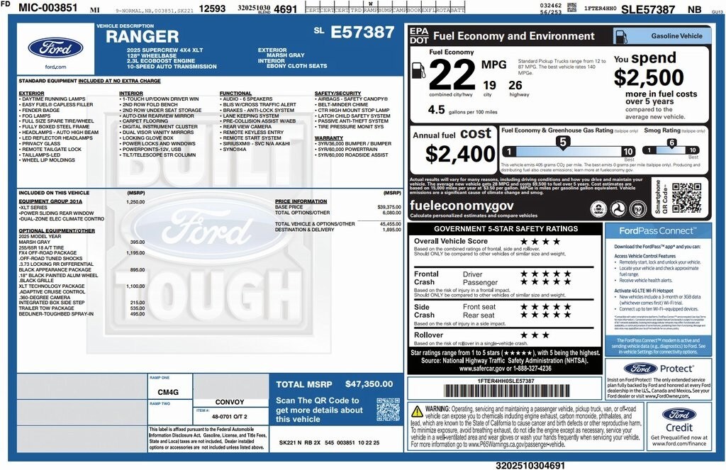 New Price! Ranger XLT, 4D Crew Cab, EcoBoost 2.3L I4 GTDi DOHC Turbocharged VCT, 10-Speed Automatic, 4WD, Marsh Gray, Seats Ebony Interior Trim Cloth, 12" Display in Center Stack, Black Appearance Package, Black Center Bar & Surround Grille, Black Rear Bumper, Body-Color Painted Front Fascia, Cloth Front Heated Bucket Seats, Dual-Zone Electronic Climate Control (DEATC), Electronic-Locking Rear Differential, Equipment Group 301A High, Front & Rear Black Ford Ovals, FX4 Off-Road Box Decal, FX4 Off-Road Package, FX4 Selectable Drive Modes, Gray Painted Center Bar & Grille Surround, Gray Painted Front Fascia & Rear Bumper, Off-Road Screen in Center Stack, Off-Road Tuned Shocks, Painted Body-Color Wheel Lip Molding, Power-Sliding Rear Window, Sport Appearance Package, Sport Box Decal, Trail Control, Unique Carpet Mats, Wheels: 18" Black Painted.