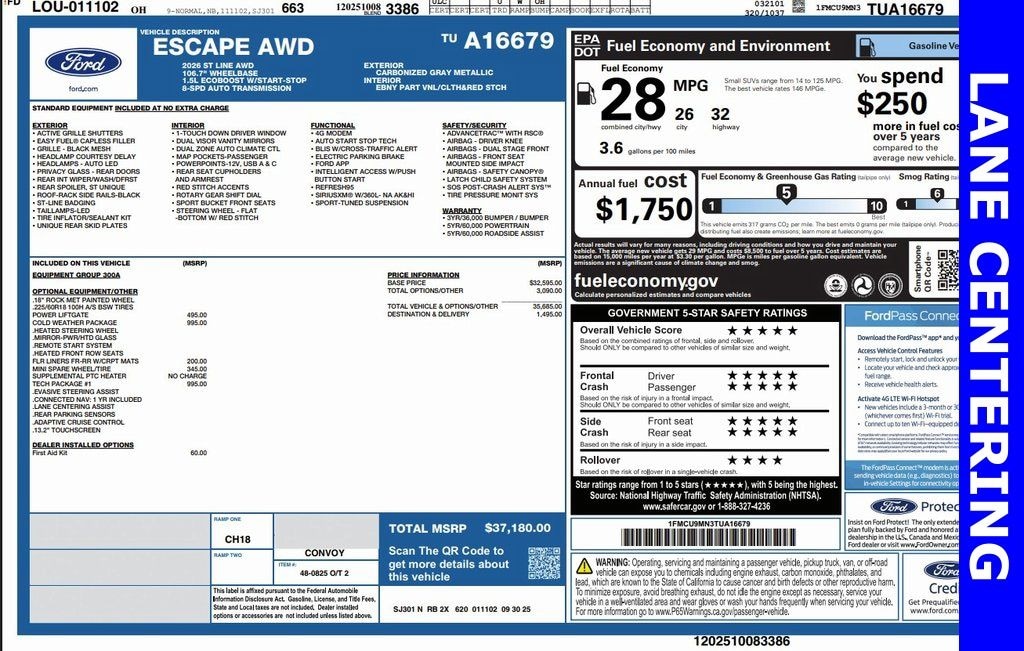 Escape ST-Line, 4D Sport Utility, 1.5L EcoBoost, 8-Speed Automatic, AWD, Gray Metallic, Equipment Group 300A, Ford Co-Pilot360 Assist+, Intersection Assist, Predictive Speed Assist, Rear Parking Sensor, Tech Pack #1. 26/32 City/Highway MPG
