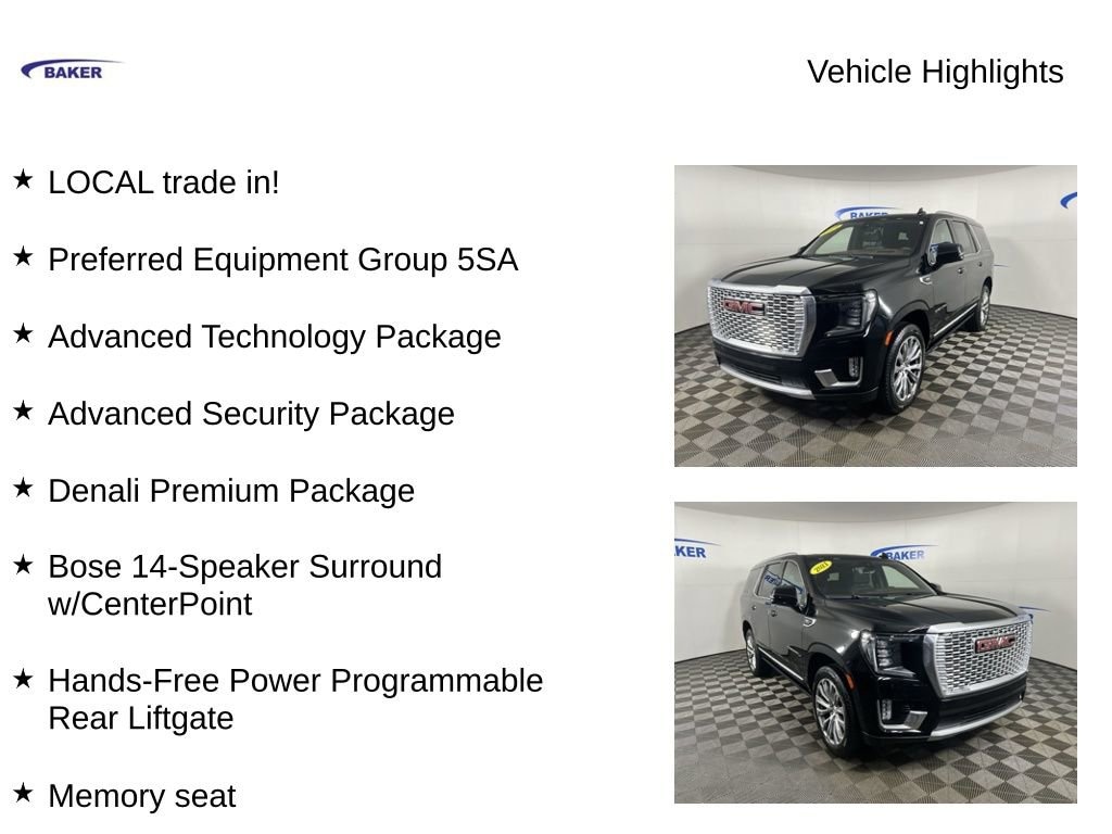 Onyx Black 2021 GMC Yukon Denali 4WD 10-Speed Automatic with Overdrive EcoTec3 6.2L V8 LOCAL trade in!, Yukon Denali, EcoTec3 6.2L V8, 4WD, Jet Black Leather, 12-Way Power Seat Adjusters, 15 Diagonal Multi-Color Head-Up Display, Adaptive Cruise Control, Advanced Security Package, Advanced Technology Package, Apple CarPlay/Android Auto, Automatic Emergency Braking, Bose 14-Speaker Surround w/CenterPoint, Bright Front & Rear Door Sill Plates, Chrome Door Handles w/Body-Color Strip, Denali Premium Package, Dual Exhaust System, Dual-Pane Panoramic Power Sunroof, Enhanced Automatic Emergency Braking, Following Distance Indicator, Forward Collision Alert, Front & Rear Park Assist, Front Pedestrian Braking, Hands-Free Power Programmable Rear Liftgate, HD Surround Vision, Heads-Up Display, Heated & Ventilated Driver & Front Passenger Seats, Heated 2nd Row Outboard Position Seats, Heated Automatic Steering Wheel, Heated Driver & Front Passenger Seats, Heated front seats, Heated steering wheel, Hill Descent Control, Inside Rear-View Auto-Dimming Mirror, Lane Change Alert w/Side Blind Zone Alert, Lane Keep Assist w/Lane Departure Warning, Memory seat, Outside Heated Power-Adjustable Mirrors, Power driver seat, Power Liftgate, Power Release 2nd Row Bucket Seats, Power-Retractable Assist Steps, Preferred Equipment Group 5SA, Rear Cross Traffic Alert, Rear Pedestrian Alert, Safety Alert Seat, Theft-Deterrent Alarm System, Universal Home Remote, Vehicle Inclination Sensor, Vehicle Interior Movement Sensor, Ventilated front seats, Wheel Locks, Wheels: 22 x 9 Bright Machined Aluminum.
