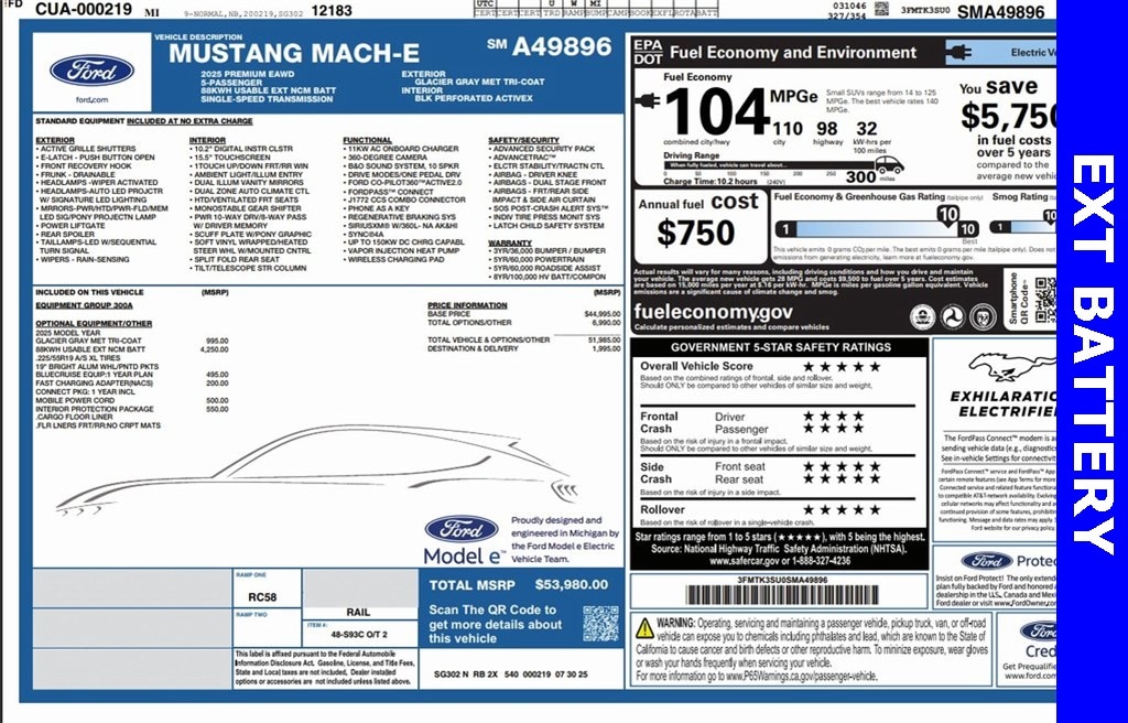 Mustang Mach-E Premium, 4D Sport Utility, Electric Motor, Single-Speed Automatic, AWD, Glacier Gray Metallic TriCoat, Perforated Activex Seat Mat'L Black Onyx, 1st & 2nd Row Floor Liners w/o Carpet Mats, Cargo Area Cover, Cargo Floor Liner, Equipment Group 300A Standard Package, Interior Protection Package. 103/94 City/Highway MPG