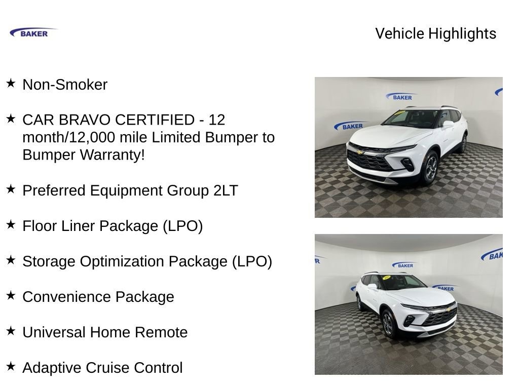 New Price! Certified. Summit White 2023 Chevrolet Blazer LT AWD 9-Speed Automatic with Overdrive 2.0L Turbocharged Non-Smoker, CAR BRAVO CERTIFIED - 12 month/12,000 mile Limited Bumper to Bumper Warranty!, 4D Sport Utility, 2.0L Turbocharged, 9-Speed Automatic with Overdrive, AWD, Summit White, Black Cloth, 1st & 2nd Row All-Weather Floor Liners (LPO), Adaptive Cruise Control, Black Roof-Mounted Side Rails, Collapsible Cargo Area Organizer (LPO), Convenience Package, Enhanced Automatic Emergency Braking, Floor Liner Package (LPO), Front Console Organizer, Heated Driver & Front Passenger Seats, Inside Rear-View Auto-Dimming Mirror, Integrated Cargo Liner (LPO), Preferred Equipment Group 2LT, Rear Power Programmable Liftgate, Storage Optimization Package (LPO), Universal Home Remote, Wheels: 18 Grazen Metallic Aluminum, Wireless Charging.