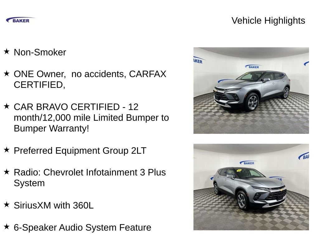 New Price! Sterling Gray Metallic 2025 Chevrolet Blazer LT AWD 9-Speed Automatic with Overdrive 2.0L Turbocharged Non-Smoker, ONE Owner, no accidents, CARFAX CERTIFIED,, CAR BRAVO CERTIFIED - 12 month/12,000 mile Limited Bumper to Bumper Warranty!, Blazer LT, 4D Sport Utility, AWD, Sterling Gray Metallic, 6-Speaker Audio System Feature, 8-Way Power Driver Seat Adjuster, Apple CarPlay/Android Auto, Auto High-beam Headlights, Automatic temperature control, Front Bucket Seats, Fully automatic headlights, Heated Driver and Front Passenger Seats, Preferred Equipment Group 2LT, Premium audio system: Chevrolet Infotainment 3 Plus, Radio: Chevrolet Infotainment 3 Plus System, SiriusXM with 360L.