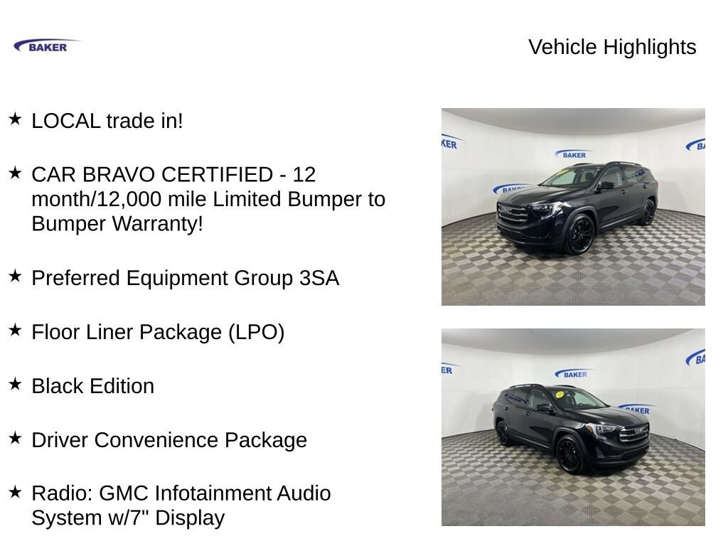 Ebony Twilight Metallic 2019 GMC Terrain SLE FWD 9-Speed Automatic 1.5L DOHC LOCAL trade in!, CAR BRAVO CERTIFIED - 12 month/12,000 mile Limited Bumper to Bumper Warranty!, Terrain SLE, 1.5L DOHC, 9-Speed Automatic, FWD, Ebony Twilight Metallic, 2 USB Data Ports w/Auxiliary Input Jack, 4-Way Manual Driver's Seat, 4-Way Manual Front Passenger Seat, 6-Speaker Audio System Feature, 8-Way Power Driver Seat Adjuster, Apple CarPlay/Android Auto, Black Edition, Black GMC Center Caps w/Black GMC Lettering, Bluetooth® For Phone, Driver & Front Passenger Heated Seats, Driver Convenience Package, Dual-Zone Automatic Climate Control, Exterior Parking Camera Rear, Floor Liner Package (LPO), Front & Rear All-Weather Floor Liners (LPO), Integrated Cargo Liner (LPO), Preferred Equipment Group 3SA, Radio: GMC Infotainment Audio System w/7 Display, Remote Start, Wheels: 19 x 7.5 Gloss Black Painted Aluminum.CALL US TODAY 6168373800. Recent Arrival! Odometer is 10412 miles below market average! 26/30 City/Highway MPGAwards:* JD Power Automotive Performance, Execution and Layout (APEAL) Study